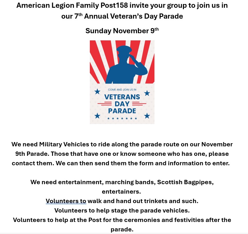 If your group wishes to participate in this event please download here and fill out the application and return to commander@post158.org